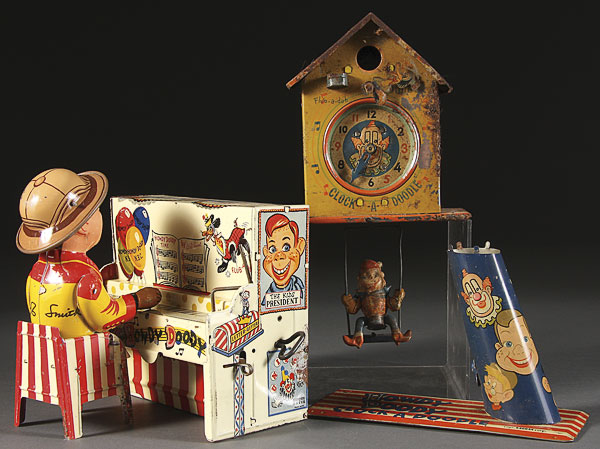 A HOWDY DOODY TIN LITHO CLOCK-A-DOODLE, MID 20TH CENTURY, some losses, together with a Bob Smith and Howdy Doody wind up piano (Doody absent). Height 10 inches.