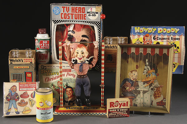 A 13 PIECE HOWDY DOODY GROUP. Comprising a German novelty toy, acrobat figure, boxed TB game, coloring books, Blue Bonnet margarine cut out box, Halloween costume, and four Welch's grape juice lithographed travel packs with bottles (three bottles absent).