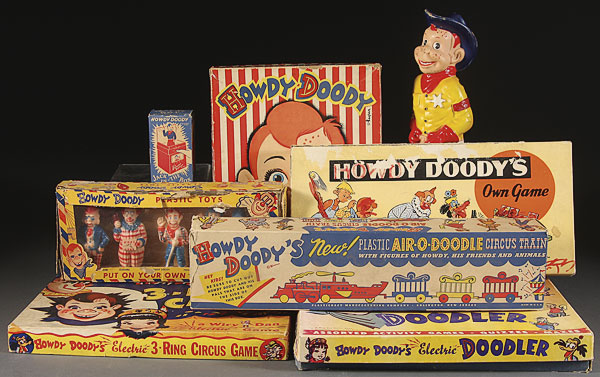 AN EIGHT PIECE HOWDY DOODY TOY AND PUZZLE GROUP, MID 20TH CENTURY, comprising a boxed plastic toy set, a three ring circus electric game, a doodler electric game, a boxed puzzle set, a Howdy Doody's Own Game, a boxed Jack in the Box, a boxed Air-O-Doodle circus train, and a vinyl figural squeeze toy.