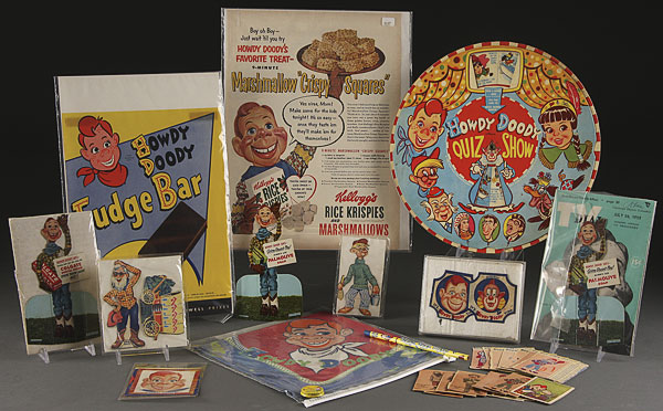 A LARGE HOWDY DOODY PAPER ADVERTISING AND EPHEMRA GROUP, EARLY 20TH CENTURY, over 75 pieces including advertising plaque, Palmolive soap die cuts, Colgate toothpaste die cuts, Blue Bonnet margarine box cut outs, a Howdy Doody bandana, Royal package backs, rotating quiz show, promotional premium die cuts including a mint in the package Mars candy bar giveaway, plus many others.