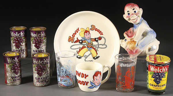 A HOWDY DOODY MEMORABILIA AND NOVELTY GROUP, MID 20TH CENTURY, 11 pieces consisting of a ceramic piggy bank, handled cup, Taylor diner plate, four Welch's grape concentrate cans and four Welch's grape jam enameled jars including one apparently unopened.