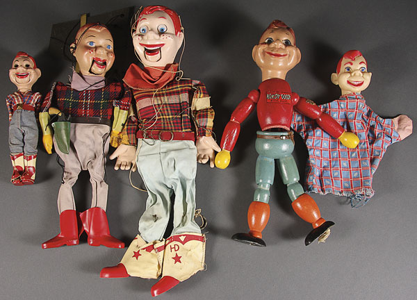 A GROUP OF FIVE HOWDY DOODY DOLLS AND MARIONETTES, MID 20TH CENTURY, comprising a wood and composition jointed doll, a large plastic Marionette, a composition Marionette, a hand puppet and a small plastic doll. Length 8 inches to 15 inches.