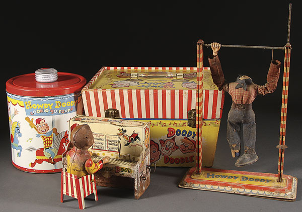 A HOWDY DOODY NOVELTY TOY GROUP, MID 20TH CENTURY, four pieces comprising a phono Doodle, a Bob Smith wind up piano (Doody absent), a German acrobat (losses), and a cookie jar humidor.