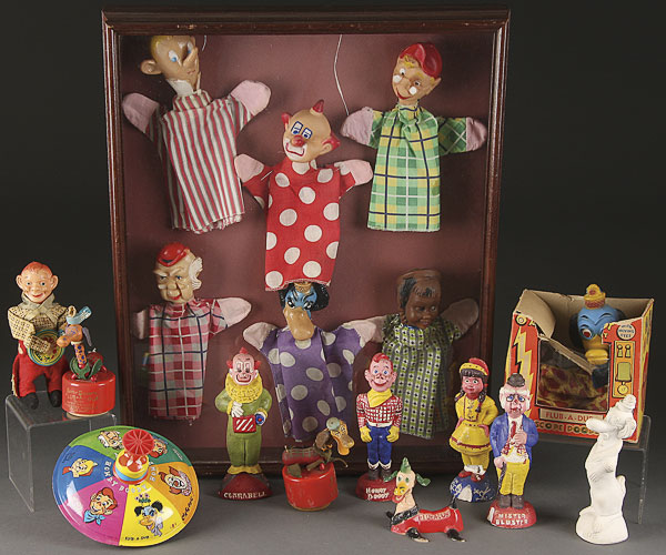 AN 18 PIECE HOWDY DOODY TOY AND NOVELTY GROUP, MID 20TH CENTURY, comprising a shadow box framed set of six character hand puppets, a Howdy Doody banjo playing wind up, a tin litho top, five cast chalkware figures, and four Flub-A-Dub items including a hand puppet in original box, a plastic figure, and two wood jointed Kohner toys.