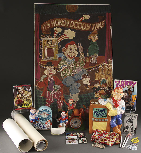 A LARGE CONTEMPORARY HOWDY DOODY EPHEMERA AND NOVELTY GROUP, LATE 20TH CENTURY, including limited edition collector's items, a figural cookie jar, clocks, music box, Hallmark ornaments, videos, bandana, posters and historical society items, over 50 pieces.