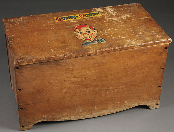 A HOWDY DOODY WOODEN TOY CHEST WITH DECAL name and portrait on lid. 30 inches by 16 inches by 17 inches.
