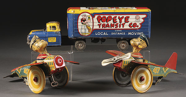A POPEYE TIN LITHOGRAPH TOY GROUP, CIRCA 1940'S, consisting of two Popeye the Pilot wind up airplanes, and a moving van all by Marx, length 12.5 inches and 8.5 inches.