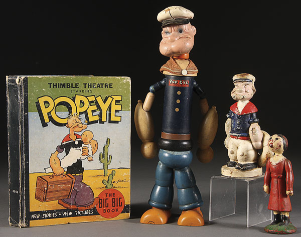 A POPEYE IDEAL POLYCHROME WOOD JOINTED FIGURE, CIRCA 1930'S, together with a 1935 Big Big Book, and two later cast iron banks of Popeye and Olive Oyl. The largest 14 inches.