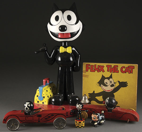 A SEVEN PIECE FELIX THE CAT CHARACTER GROUP, CIRCA 1930'S TO CONTEMPORARY, comprising two wooden trix racers, a jointed wood figure (losses), a 1931 McLaughlin book, a comic book, a pop-up figure, and a limited edition composition large head bobble, height 21 inches.
