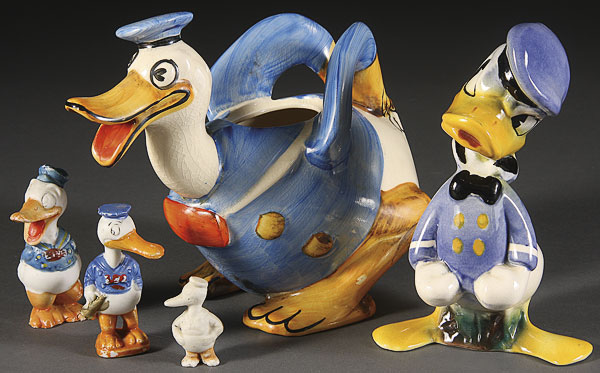 FIVE VINTAGE WALT DISNEY CERAMIC DONALD DUCK FIGURES, MID 20TH CENTURY, comprising a Wade, English figural tea pot (missing lid and repaired neck), three scarce Japanese painted bisque figures including a musical duck with horn and a 1940s American pottery figure probably by Evan Shaw. Height 2 inches to 7 inches.