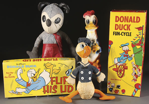 A FIVE PIECE VINTAGE WALT DISNEY DONALD DUCK COLLECTION. Comprising a knickerbocker figure, a polychrome chalk carnival figure, a "Flips His Lid" box game, and a boxed "Fun-Cycle", together with an artist made early style Mickey Mouse. Largest 22 inches.