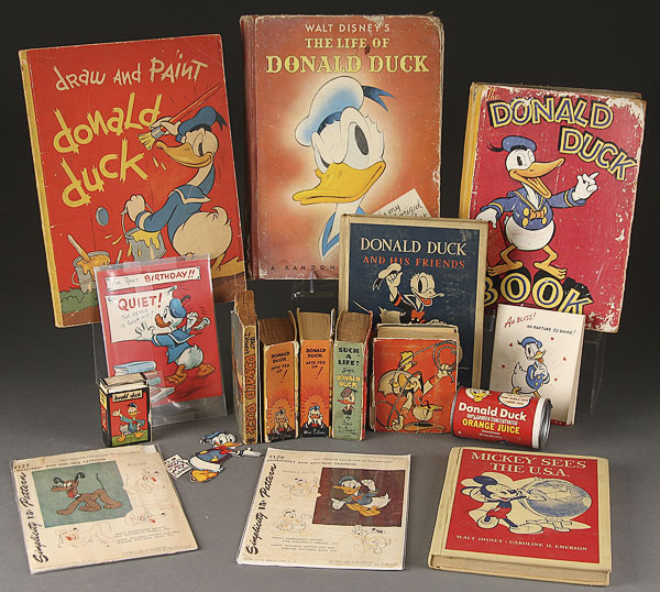 A 21 PIECE DONALD DUCK EPHEMRA AND EARLY BOOK COLLECTION, 1930'S TO 1950'S, including better little boxes, a Gene Air story book dated 1939, an Emerson story book, draw and paint, and other items.