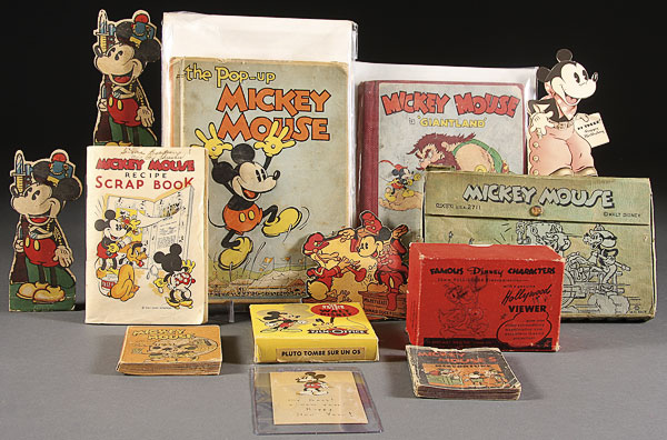 A 25 PIECE EARLY MICKEY MOUSE COLLECTION, 1930'S- 1950'S, including a wooden cannon with two paper litho Mickey Mouse soldiers. A 1933 pop-up book, a Mickey Mouse In Giant Land book, a cased pencil set, miniature books, die cuts, recipe scrap book for Wholesome Bread, a French cartoon film, Post Toasties cardboard box cut outs and uncut joinies, and other items.