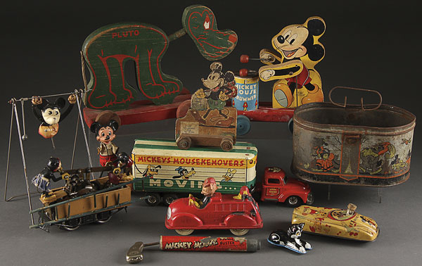 A WALT DISNEY MICKEY MOUSE CHARACTER COLLECTION. 13 pieces, early to mid 20th century, including a custom Mickey and Minnie hand car by Horatio Bertian, a Fisher Price drummer, a wood Pluto pull toy, sun rubber car, partial trapeze artist, and other items. Most with losses.