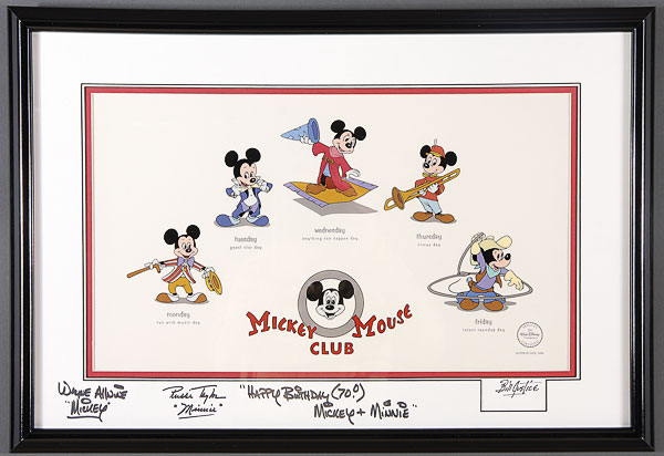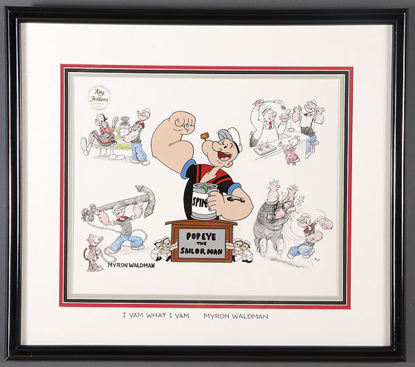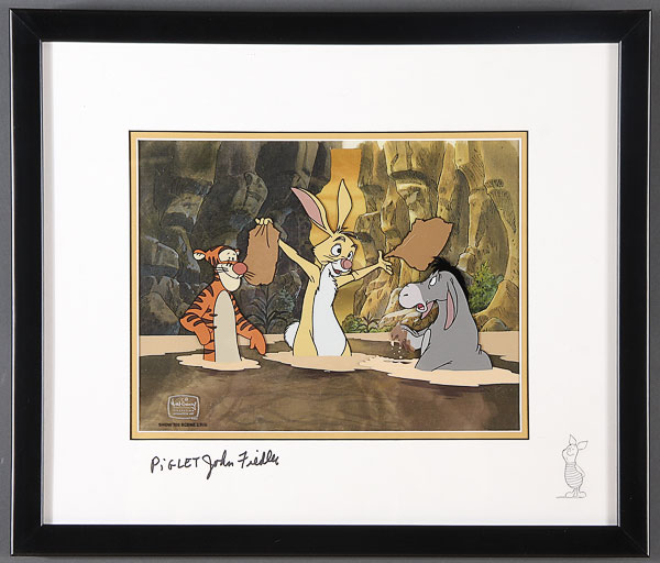A POPEYE, WINNIE THE POOH AND MICKEY MOUSE CLUB LIMITED EDITION HAND PAINTED AND SERICEL COLLECTION, LATE 20TH CENTURY, comprising a "I Yam What I Yam" by Myron Waldman, "Pooh's Grand Adventure" signed Piglet by John Fiedle, and Mickey Mouse Club with artist signatures including Bill Justice, all framed and matted. 18 inches by 21 inches, and 18 inches by 26 inches overall.