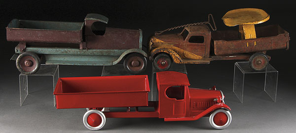 THREE PRESSED STEEL TOY TRUCKS, CIRCA 1930'S, comprising a Buddy L sit and ride, a Structo dump truck, and a reproduction steel dump truck. Length 24 inches.