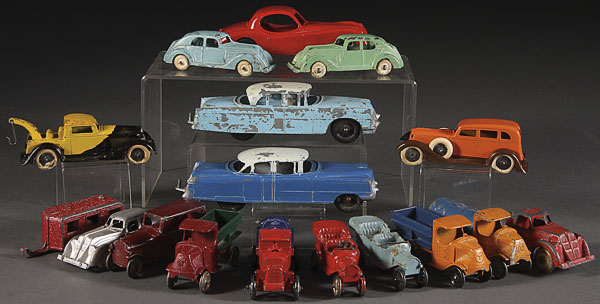 A GROUP OF TWENTY SLUSH MOLD TOY CARS AND TRUCKS, EARLY TO MID 20TH CENTURY, some tootsie and hubley. Length 3 inches to 5 inches.