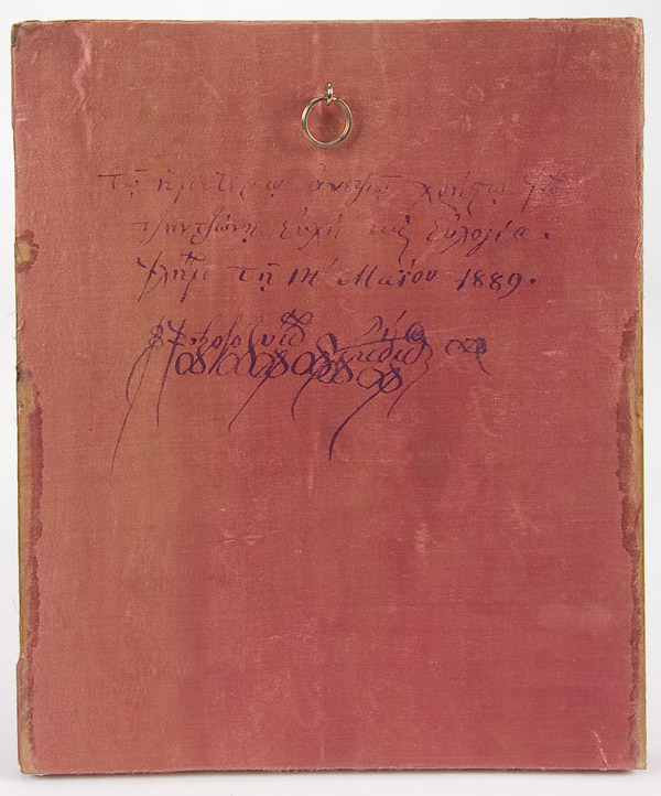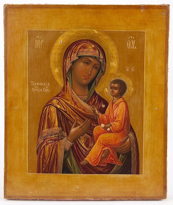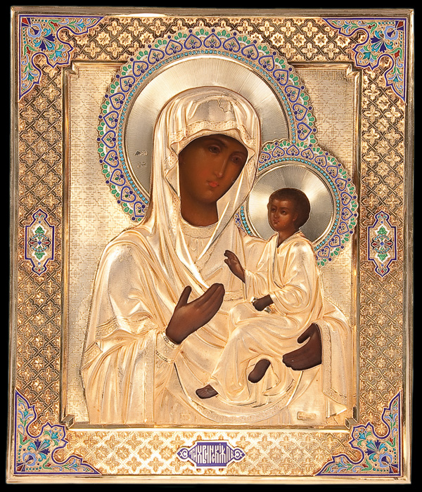 AN EXCEPTIONAL RUSSIAN ICON OF THE TIKHVIN MOTHER OF GOD, 1880. The finely painted icon rendered with extensive gilt highlights and cross hatching tonal development. The entire painted panel overlaid with a heavy multiple -piece and exquisite silver-gilt and repousse riza with attached cloisonnE enameled haloes, side, corner, and title plaque. Hallmarked Moscow, dated 1880 and with Cyrillic makers mark AK- most likely for Antip Kuzmichev, a noted silver and goldsmith active in Moscow circa 1856-1897. The verso of icon with original silk covering exhibiting an old dedicatory inscription in highly stylized lettering and dated 1889. 12.25 inches x 10.4 inches (31cm x 26.5cm). The Tikhvin Mother of God is one of four immediately recognizable Russian Miracle-Working images of the Mother of God. Along with the Vladimir, Kazan, and Smolensk, the Tikhvin has a long and interesting history. The original Tikhvin was believed to have been painted by Saint Luke, who sent it as a gift to the ruler Theophilus at Antioch. After Thoephilus’ death it went to Jerusalem. In the 5th century it was sent as a gift to Pulcheria, sister of Theodosius the Younger, in Constantinople. It was sent by Eudokia, wife of Theodosius. The Church of the Blachernae was built to house it, and it remained there for over five hundred years under the title Hodigitria. In 1383, knowing of the approaching fall of Constantinople to the Turks, the icon left that city for Russia (it is not uncommon in these origin stories for icons to act like living beings). Some fishermen saw it in a circle of light over Lake Ladoga, and then it appeared again near Lake Onega, then on the Oyat River, and then twice more, moving ever closer to Tikhvin. Finally, it appeared on the bank of the Tikhvinka River in 1383, during the reign of Dmitriy Donskoy. The icon was placed n a wooden church which then burned in 1390, but the icon was found unharmed in a juniper bush. In 1395 it survived another fire, and in 1500 yet another. In the 16th century it was placed in a brick church dedicated to the Dormition, and in 1613, after the vision of a blind widow, it was used to repel the Swedes by being carried in a procession, following the instructions given by the Mother of God. Its feast day is June 26. In 1944 During the Soviet oppression of the Russian Orthodox Church, the icon was rescued, eventually coming to the United States for safekeeping by future Archbishop John Garklavs. In 2004, the original Tikhvin icon was transferred back to Russia and returned to its home village of Tikhvin.