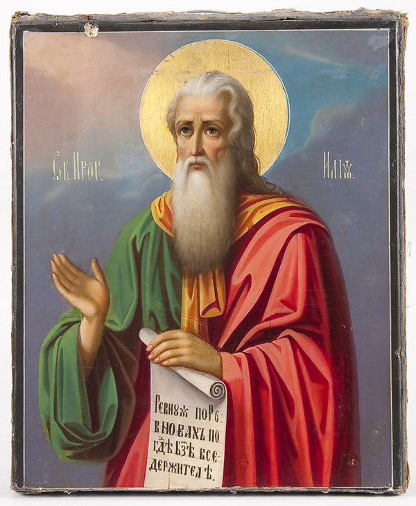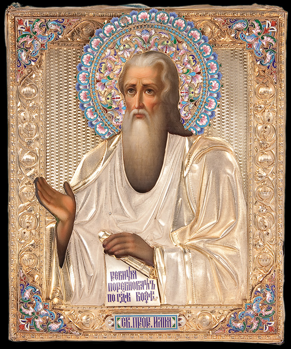 A FINE RUSSIAN ICON OF THE PROPHET ELIJAH, circa 1900. Naturalistically rendered, the great prophet looks heavenward while holding an open scroll upon which is inscribed, With zeal have I been zealous for the Lord God of hosts. (1Kings 19:10). The entire image overlaid with a silver-gilt and repousse riza with applied shaded enamel halo and corners and with champleve enameled title plaque and scroll text. Riza hallmarked Moscow, 1899-1908 and with Cyrillic makers mark S.G., probably Sergiy Gubkin. Verso covered in old worn velvet. 10.6 inches x 8.75 inches (27cm x 22.2cm).