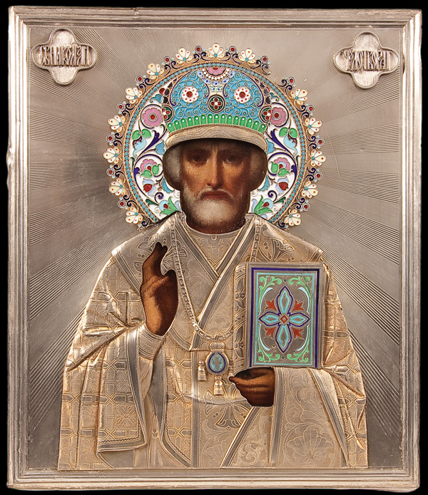 A RUSSIAN ICON OF SAINT NICHOLAS, CIRCA 1908-1917. Realistically painted, depicted in Bishop's attire, delivering a blessing and holding a book of Gospels. Overlaid with a silver-gilt engraved riza with cloisonne enameled halo, Gospel cover, and panagea. Hallmarked Moscow, 1908-1917. Cyrillic makers mark of the 1st Artel and with 84 standard. 12.25 inches x 10.5 inches (31 x 27 cm).
