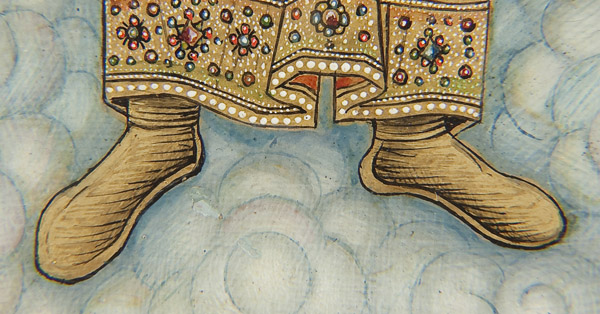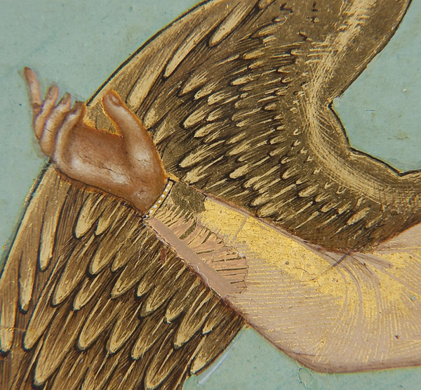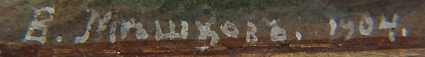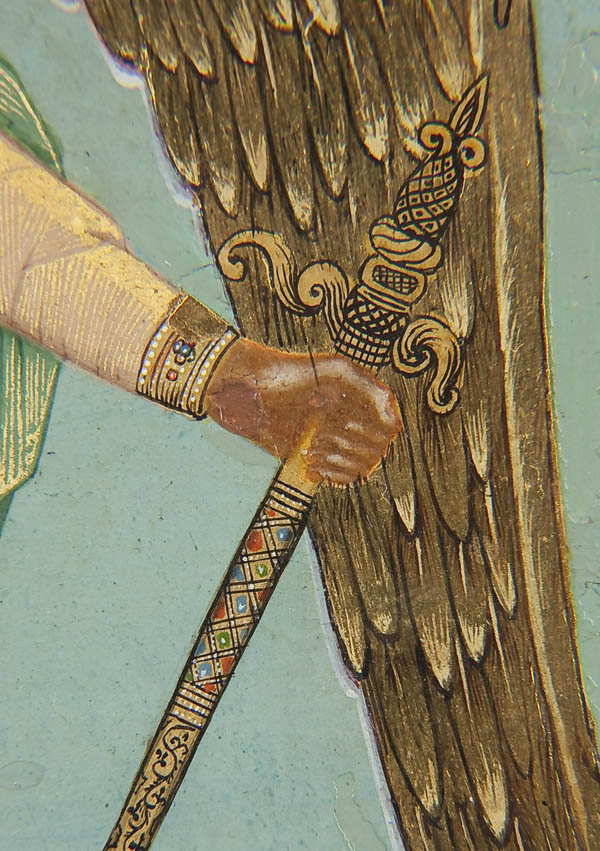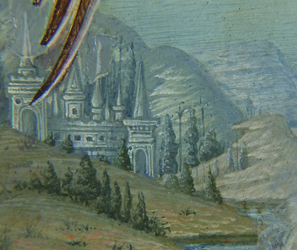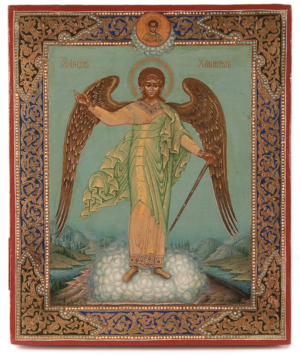 AN EXCEPTIONAL SIGNED RUSSIAN ICON OF THE GUARDIAN ANGEL, WORKSHOP OF DIKAREV-1904. Depicted full length, the Guardian Angel with arms spread and holding a sword rests atop a cluster of highly stylized clouds, a hallmark of the distinct and popular Mstera icons. The garments finely jeweled and decorated with intricate chrysography. The background inscribed in highly stylized gilt Slavonic lettering 'The Holy Guardian Angel'. Below, the distant background is rendered in miniature depicting rivers, hills, forests and a walled city all executed in the typical Dikarv, Chirikov or Guryanov style. The top central border with a medallion cartouche depicting Christ Emmanuel partially encircled within characteristic Mstera style clouds. The borders ornately incised in faux enameling and the lower right corner signed in Cyrillic 'V. Mishkov' and dated 1904, and the edges and verso of wood panel tinted in red as is often found on such icons. Exquisite! 10.5 inches x 8.75 inches (26.2 cm x 22.4cm).
