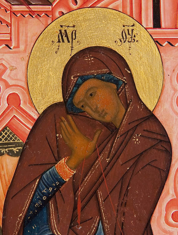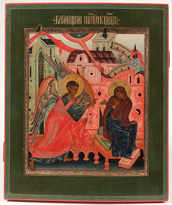 A RUSSIAN ICON OF THE ANNUNCIATION, MSTERA CIRCA 1900. An exceptional icon painted in the Mstera style with graduated shaded background, decorated kovcheg and highly stylized buildings and select white highlights in the garments. 10 inches x 12 inches (31 x 26 cm).