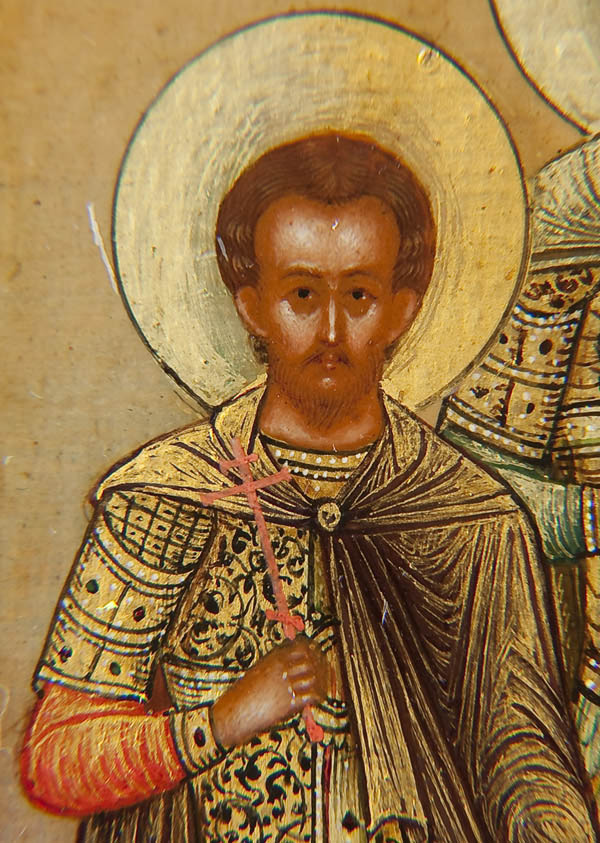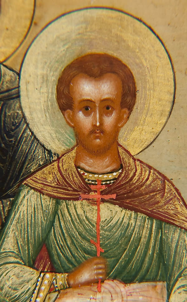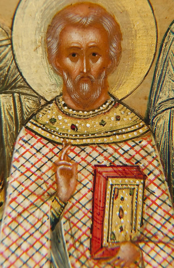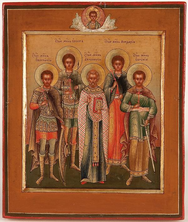 A VERY FINE PERSONAL RUSSIAN ICON OF THE 'FIVE COMPANIONS', WORKSHOP OF DIKAREV, CIRCA 1900. Within a beveled gilt-lined reserve five full length images finely rendered in the Mystera style with tinted haloes against a shaded background in graduated tones. From left to right they are: The Holy Martyr Eustratius, The Holy Martyr Orestes, The Holy Martyr Auxentius, The Holy Martyr Mardarius and the Holy Martyr Eugene. The central upper margin with an image of Christ Emmanuel within a medallion encircled by characteristic Dikarev style clouds. 5.25 inches x 4.4 inches (13.4cm x 11.1cm).