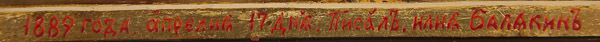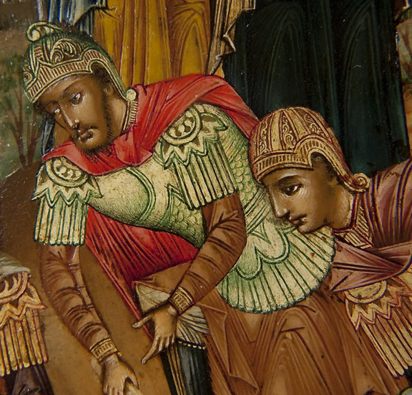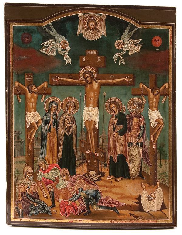 AN EXCEPTIONAL SIGNED RUSSIAN ICON OF THE CRUCIFIXION, PALEKH 1889. In the center is the Crucified Christ upon the cross. At the top within an arch is the Holy Visage-The Not Made by Hands Image of Christ. And on either side are two descending Angels of the Lord. In the upper left corner is the sun (SOLNTSE), which has darkened and upper right the moon (LUNA), which has become as blood, an allusion to Joel 2:31 and Acts 2:20. The cross is inscribed in various places with abbreviated inscriptions such as at the top TSAR SLAVUIY (King of Glory) and on the cross beams SUIN BOZHIY (Son of God). On the slanted footboard is the Greek word NIKA, meaning 'He [Jesus] Conquers.' Flanking the upright central cross section are two implements of the Passion, on the left a spear and on the right the sponge on a reed. Beneath the slanted footboard are the Slavonic letters M L R B which abbreviate MESTO LOBNOE RAY BUIST, 'The Place of the Skull Becomes Paradise.' Below further still is a skull within a hole symbolizing the skull of Adam. In tradition Adam’s tomb is said to have been at Golgotha and his skull and bones were exposed by an earthquake during the crucifixion. In this example Adam is seen about to rise out of the earth. Also being crucified is, to the left of Christ, the Penitent Thief and on the right the unrepentant thief. Standing on the ground at left beside the cross are the two Mary’s and on the right the Apostle St. John and the Roman Centurion Longinus whose hand is held in a blessing configuration of the type favored by the Old Believers. At lower left another scene has been added, Roman soldiers cast lots to determine who would take the seamless robe which belonged to Christ (Mt 27:35; Mk 15:24; Lk 23:34; John 19:24). Thus fulfilling the prophecy, 'They divide My garments among them, and for My clothing they cast lots' (Ps. 22:18). In the background the city walls of Jerusalem are seen and in the lower right corner the icon is inscribed in Slavonic This icon was painted on the 17th day of April in the year 1889 by Ilya Balyakin. This date would seem to correspond to Holy Wednesday of the same year, 1889. The Balyakin family was one of many noted Palekh family icon dynasties.13 inches x 10.25 inches (33cm x 26cm).