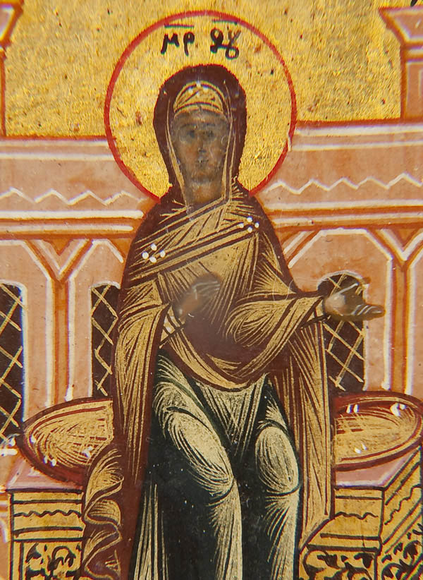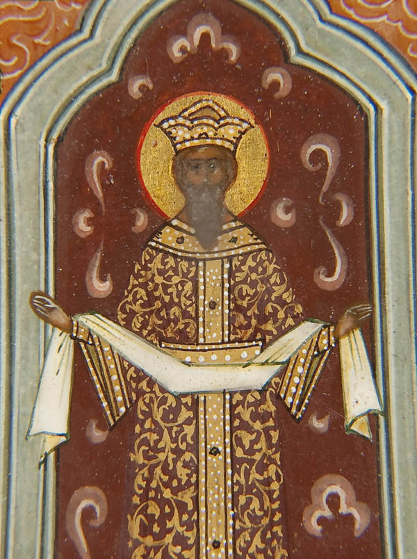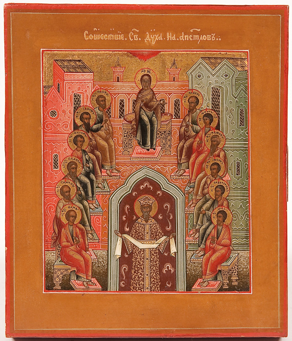 A RUSSIAN ICON OF THE DESCENT OF THE HOLY SPIRIT, MSTERA CIRCA 1900. In this variant the twelve Apostles are seated in a semi-circle, the Mother of God at top, and below a crowned man holding a cloth between his outstretched hands. He symbolizes the world (cosmos) which once was pure but is now tainted by sin. His crown symbolizes the rule of sin, and he is in a dark place, the world without faith. He is old, aged by the sin of Adam. 7 inches x 6 inches (18 x 15 cm).