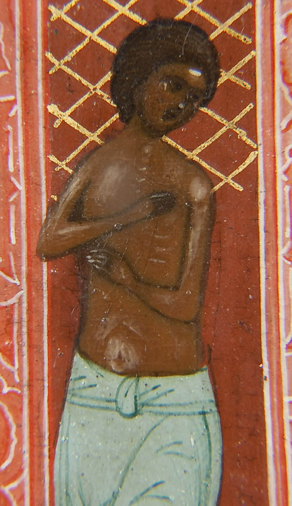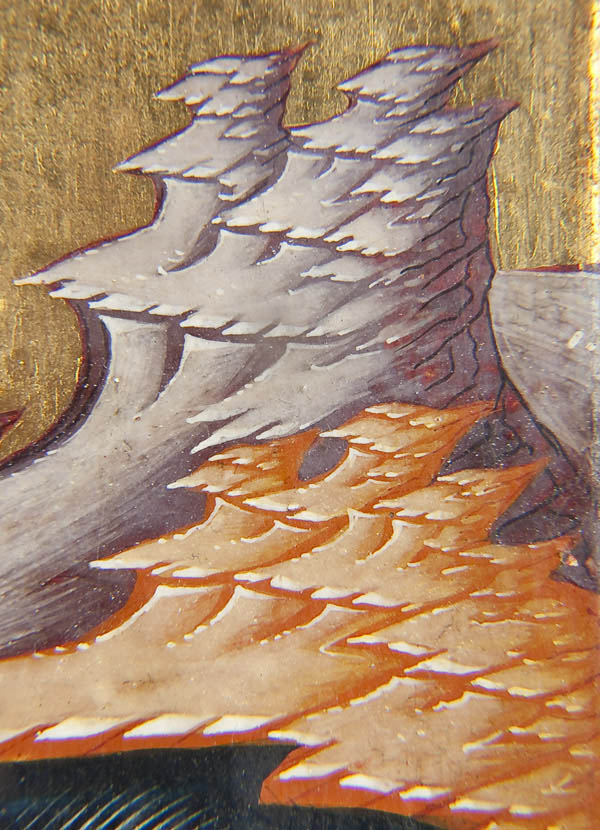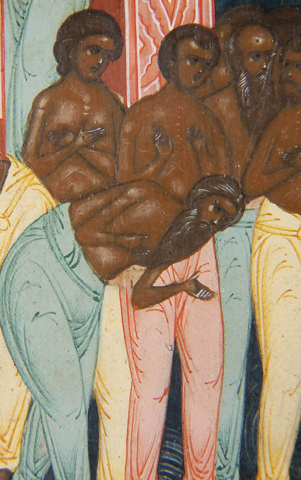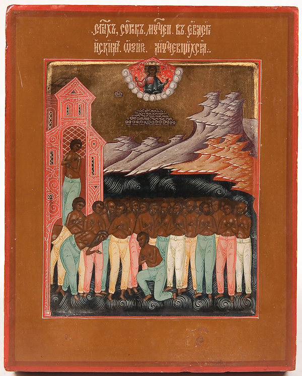 A RUSSIAN ICON OF THE FORTY MARTYRS OF SEBASTE, MSTERA OR PALEKH SCHOOL, CIRCA 1890. They suffered under the Emperor Licinius in 320 A.D., being made to stand all night in an icy lake near Sebaste, in Armenia, before their execution. Here they are seen on the frozen lake. One figure, is entering the warm bathhouse at left abandoning his suffering companions. But another figure has just removed his upper garments and is joining them. Christ is shown above with forty crowns of martyrdom. 8.5 inches x 7 inches (22 x 17.5 cm).