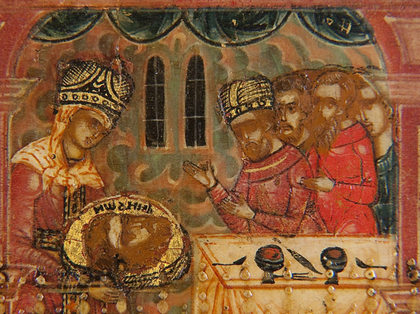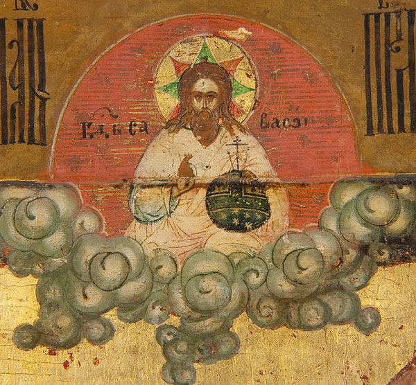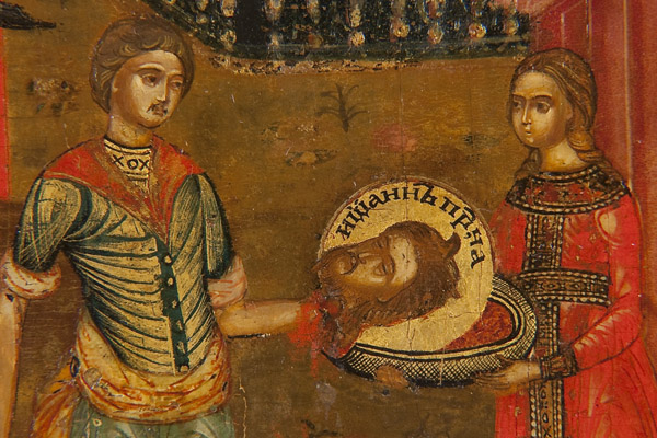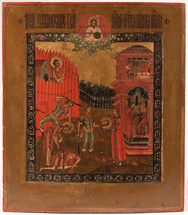 A RUSSIAN ICON OF THE BEHEADING OF JOHN THE BAPTIST, PALEKH, 19TH CENTURY. This icon illustrates the Gospel account of the death of John the Baptist as recounted in Mark 6: 17-29 and Matthew 14: 1-12. In the upper left John is seen praying while in prison, depicted here as a red walled structure. At lower left two overlapping images, John standing as he is about to be beheaded and his headless body on the ground. At center the executioner presents the head to Salome upon a salver. At lower right Salome presents the head to her mother Herodias and at upper right Herodias and Herod at court with the head of John. At top center is God the Father who holds an orb, delivers a blessing and whose head is encircled with the distinct eight pointed star or glory (slava) signifying the Day of Eternity. The inner border (kovcheg) ornamented with scrolling foliage. The upper border with a highly stylized and condensed inscription which reads USEKNOVENIE GALVUI SVYATAGO PROROKA IOANNA PREDTECHA-The Cutting Off of the Head of The Holy Prophet John the Forerunner. 14 inches x 12.25 inches (35.5cm x 31cm).