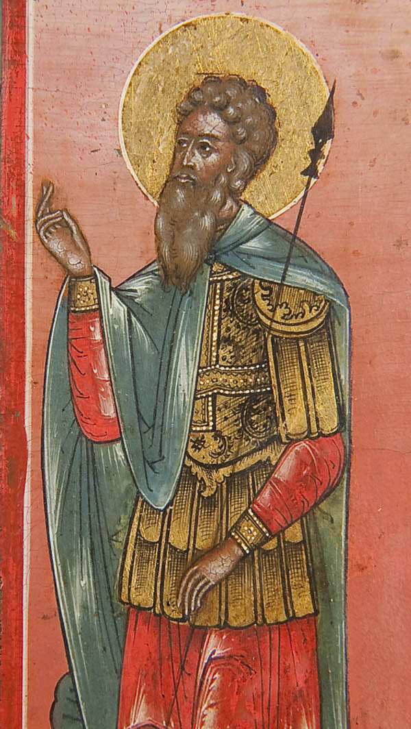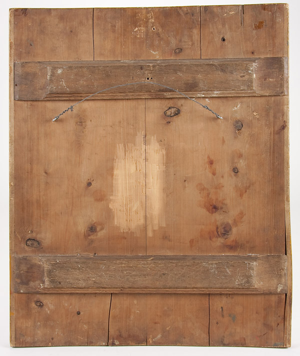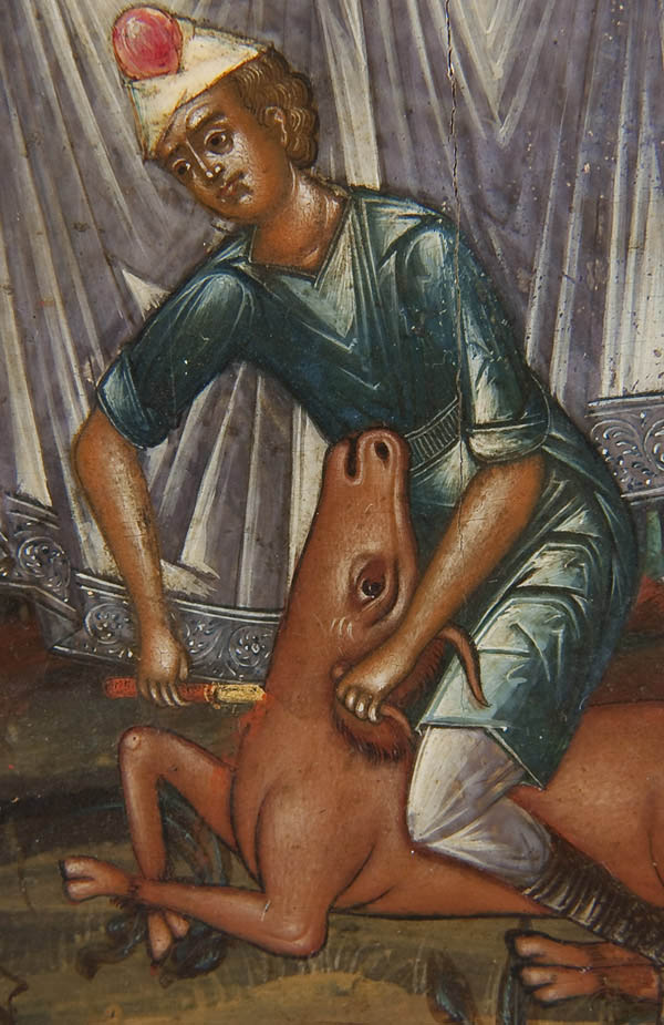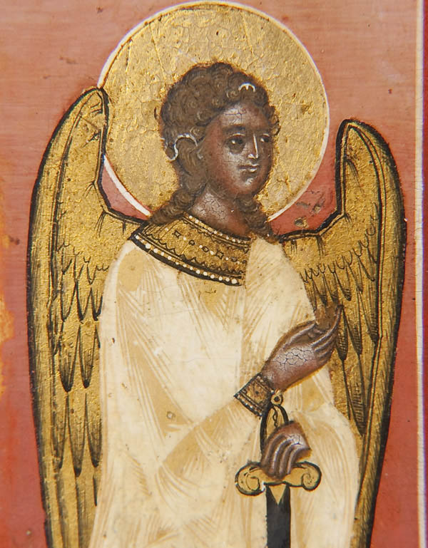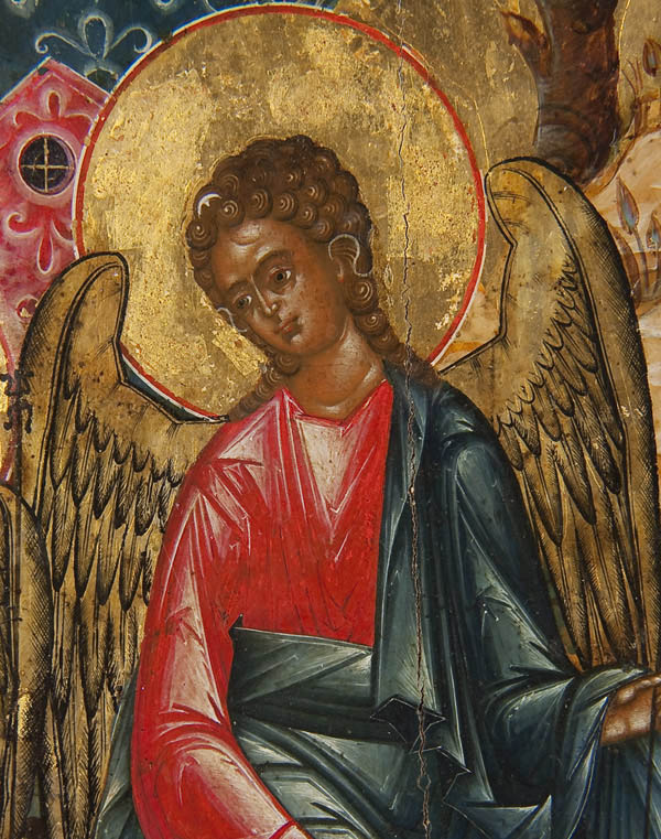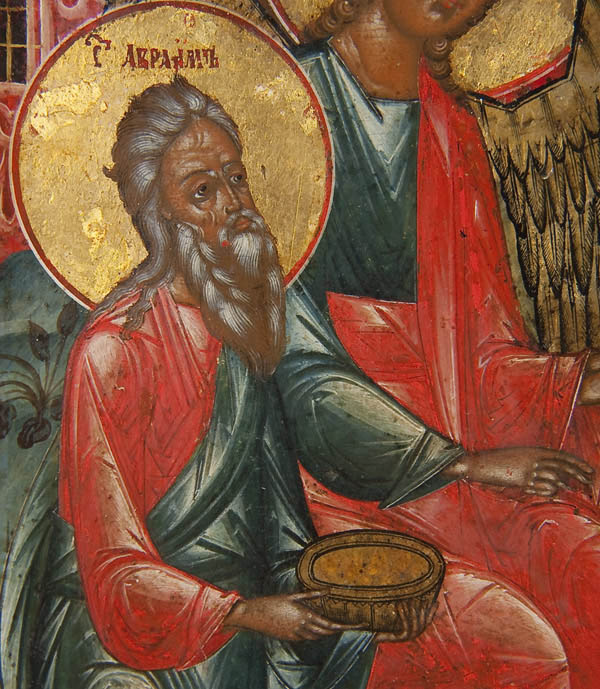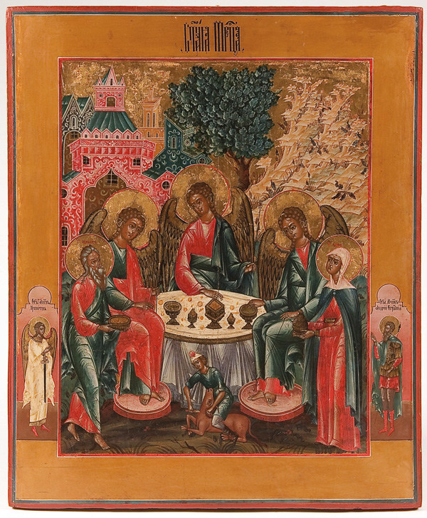 A LARGE AND EXCEPTIONAL RUSSIAN ICON OF THE OLD TESTAMENT TRINITY, MOSCOW, PERHAPS PALEKH, CIRCA 1850. This icon depicts the three angels that appeared to Abraham at the Oak of Mamre as recorded in the book of Genesis chapter 18. The three angels are seated at a table, the Patriarch Abraham is depicted lower left and his wife Sara is shown lower right, both serving the visitors. Below them is a servant slaying a calf. In the background are highly stylized buildings, a tree (the Oak of Mamre) and hills. Generally speaking the three persons of the Trinity are not distinguished by inscriptions, however some understood them thusly: Christ at center, above whom is a tree, signifying the wood of the cross; God the Father at left, before a building symbolizing the Church, and the Holy Spirit on the right, below a hill signifying spiritual ascent. The left border displays the Guardian angel and the figure on the right border is identified by his inscription as, The Holy Martyr Andrew Stratelates who holds his right hand in a blessing in the manner favored by the Old believers thereby suggesting this icon may have been commissioned for a faithful Starovery. An excellent icon in a fine state of preservation. 21.1 inches x 17.6 inches (54cm x 44.5cm).