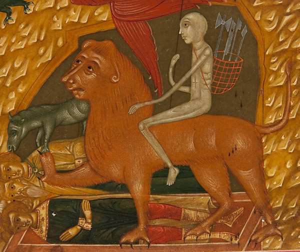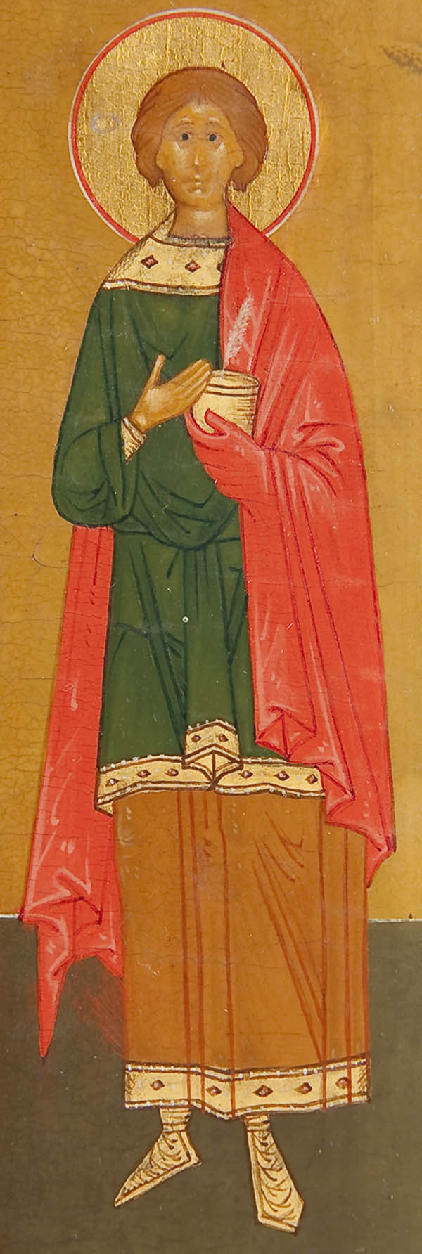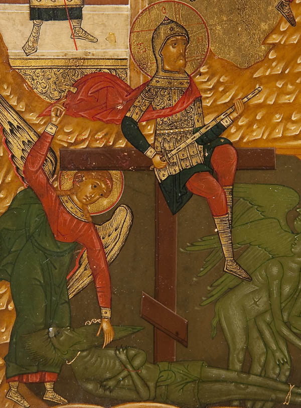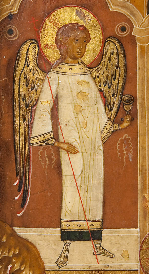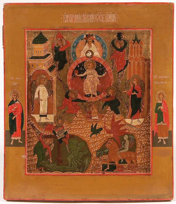 A RUSSIAN ICON OF THE ONLY BEGOTTEN SON, MOSCOW CIRCA 1900. A finely rendered icon of this complex scene, which illustrates the second antiphon of the liturgy of St. John Chrysostom, which begins 'Only Begotten Son and Word of God…'. The borders with a martyr saint (left) and St. Panteleimon (right). 14 inches x 12.25 inches (36 x 31 cm).