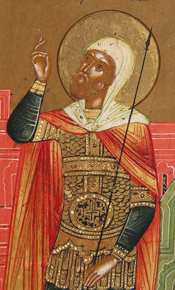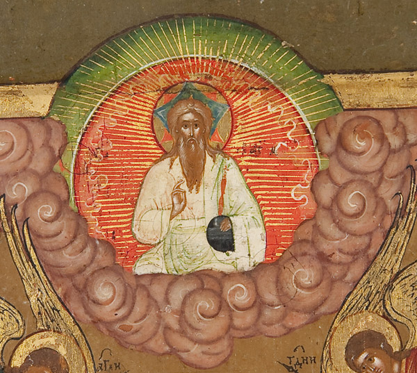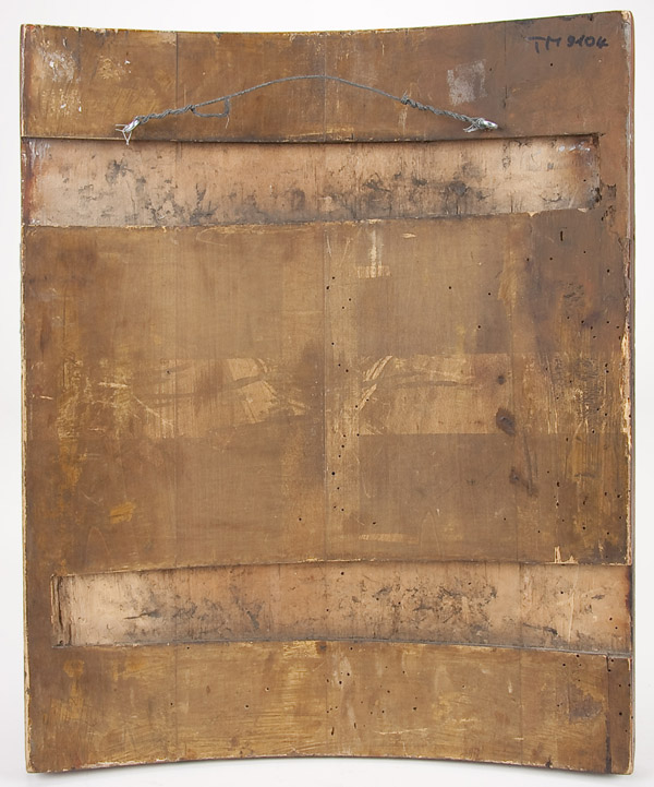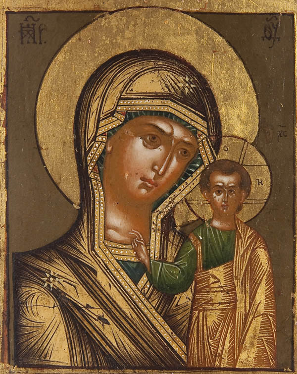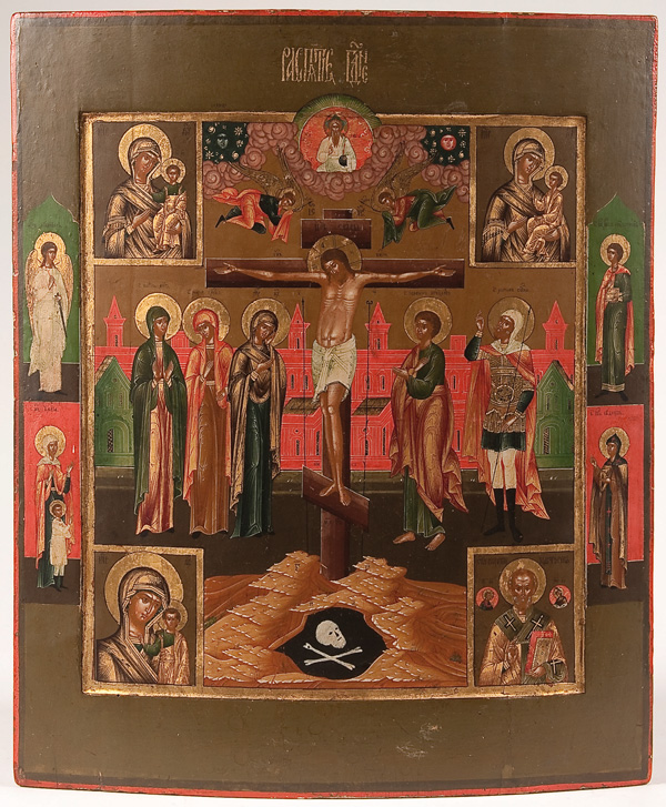 A LARGE RUSSIAN ICON OF THE CRUCIFIXION, PROBABLY PALEKH, CIRCA 1890. At center a colorful and ornate rendering of the Crucifixion scene. And in each corner images of the Smolensk Mother of God, the Tikhvin Mother of God, the Kazan Mother of God and St. Nicholas. The borders with the Guardian Angel, St .Panteleimon, St. Evdokia, and Sts. Ulita and Kirik. Probably an Old Believers icon. 17.5 inches x 15 inches (44.5 x 38 cm).