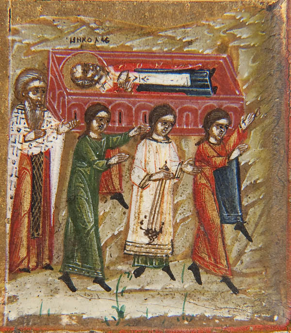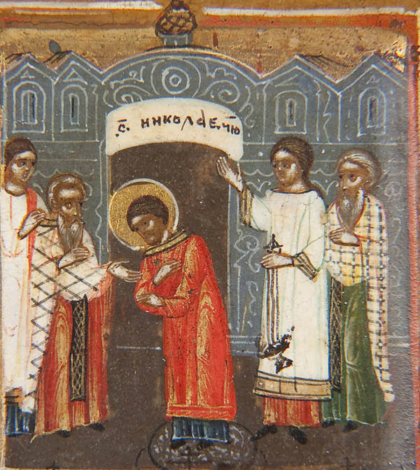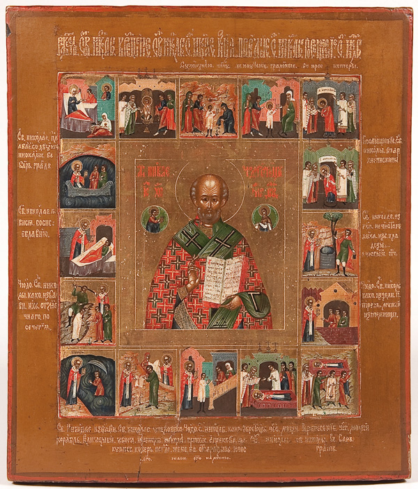 A FINE RUSSIAN ICON OF ST. NICHOLAS WITH LIFE SCENES, MOSCOW, 19TH CENTURY. At the center Nicholas, dressed in Bishops vestments, delivers a blessing and holds an open book of Gospels to Luke 6:17 (The beatitudes). At shoulder height on the left Christ presents Nicholas the Gospels and on the right the Mother of God presents his bishop’s stole. The central image is surrounded by 16 scenes related to the life and times of St. Nicholas. They are identified by accompanying inscriptions upon the border. Read top to bottom and from left to right they are, The birth of Nicholas, his baptism, the healing of a blind woman, his learning letters, his consecration as deacon, his finding of a spring of water, his consecration as bishop, his appearance to the eparch Evlavius, the driving of a devil out of a tree beside a well, the rescue of three condemned to execution, his appearance to three wrongly-imprisoned men, the saving of the drowning boy, Nicholas saving a poor merchant by buying his rug and giving back, the return of the boy Agricola to his parents, the death of Nicholas, and the transfer of the relics of Nicolas from Myra to Bari in Italy. Overall in very good condition. 12.25 inches x 10.6 inches (31cm x 27cm).