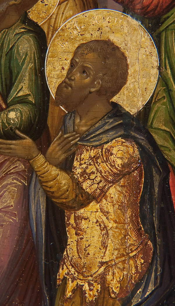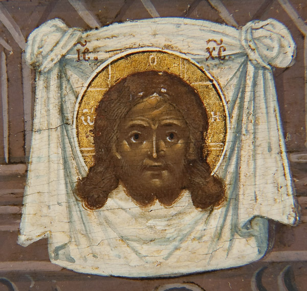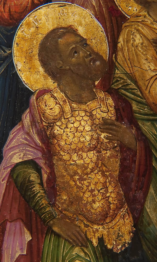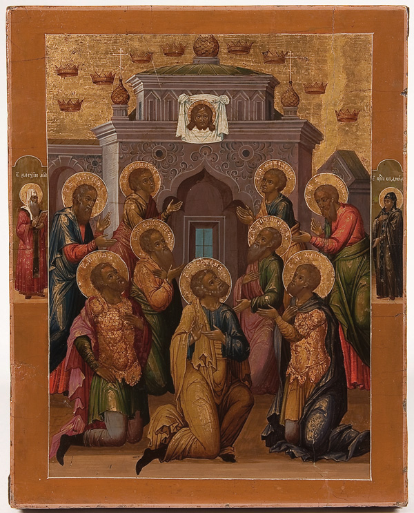 A FINE RUSSIAN ICON OF THE NINE MARTYRS OF KIZYKOS, CIRCA 1800. According to legend, these nine died for their faith in the Fourth Century. They are seen here before the church at Kizykos, (Greece) which displays an icon of the Holy Visage above the entrance. The name of each martyr is inscribed within each halo: Magnos (bones broken), Theognis (whipped and nails pulled out), Rufus (blows and fire), Antipatros (tortured with thorns), Theostikhos (fingers cut off, etc.), Theodotos (scalded), Thaumasios (knife and lance), Artemas (pushed off a mountain while in a chariot); and Philemon (buried alive). In Slavonic their names are Magn, Feognid, Ruf, Antipatr, Feostikh, Feodot, Favmasiy, Artema, and Filimon. Their martyr’s crowns are depicted in the upper margin floating above upon the gilded sky. The icon is finely painted and exhibits extensive gilt-highlights and fine detailing throughout, typical of higher quality icons of the period. The borders with family saints, on the left Alexi Metropolitan of Moscow and on the right the Venerable Evdokia. The Nine Martyrs of Kizykos are commemorated on the 29th of April. A fine icon of a less frequently encountered subject and in an excellent state of preservation. 12.25 inches x 9.75 inches (31cm x 25cm).