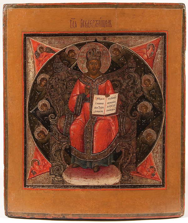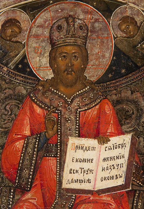A RUSSIAN ICON OF CHRIST ENTHRONED, 18TH CENTURY. Christ sits atop an ornate silver throne resting atop a eight-pointed glory signifying the Day of Eternity, He delivers a blessing and holds an open book of Gospels to Matthew 11:28 and is surrounded by cherubims. The corners with the symbols of the Four Evangelists and the kovcheg decorated. 13.75 inches x 12 inches (35 x 30.5 cm).