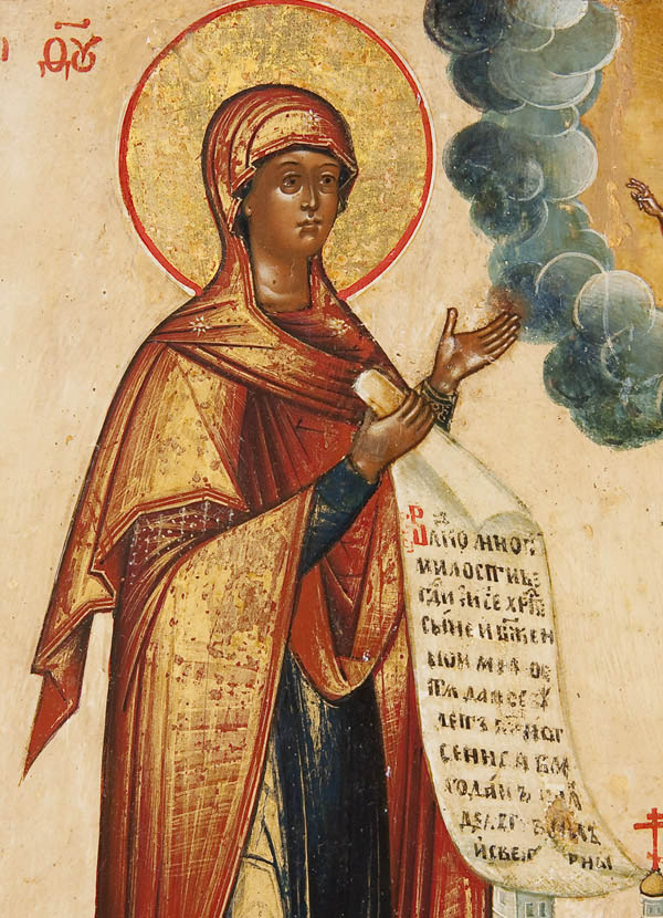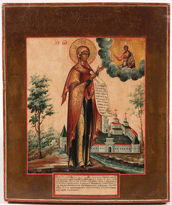 A RUSSIAN ICON OF THE BOGOLIUBSKAYA MOTHER OF GOD, 19TH CENTURY. Here the Mother of God is depicted turned in an attitude of prayer before her son Jesus Christ who delivers a blessing from the heavens at upper right. She holds a scroll which begins, 'Ruler most gracious, Lord Jesus Christ, my son and my God, hear the prayer of your Mother for she prays for the world.' At the center of the lower margin a rectangular cartouche is inscribed, 'This is the image of the appearance of the Most Holy Mother of God to the holy and great prince Andrei Georgievich in the year 1155, June, the 18th day on the same place where now is too be seen the white stone church of the Most Holy Mother of God founded by the true-believing prince Andrei Georgievich Bogoliubsky from which the Bogoliubov Monastery takes its name.' The Bogolyubovsky Monastery is illustrated in the background. 13.75 inches x 11.6 inches (35cm x 30cm).