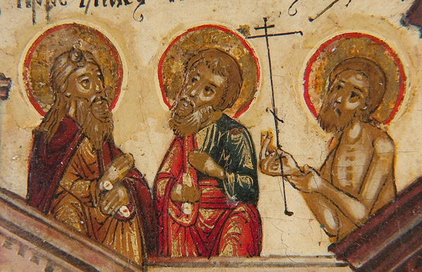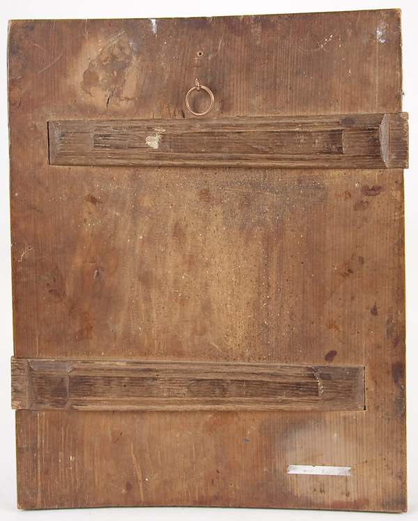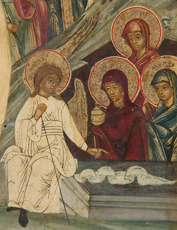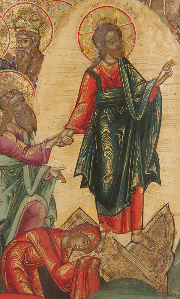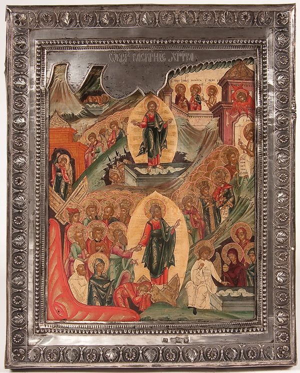 A FINE RUSSIAN ICON OF THE RESURRECTION AND DESCENT INTO HADES, YAROSLAVL, CIRCA 1800. In this complex rendering two scenes related to the Easter theme are depicted. At the upper central section Christ stands triumphant over death atop an empty tomb, while Roman soldiers nearby sleep. In the lower right corner an angel speaks to the Myrrh-bearing women and at mid left an angel binds Hades. At the lower central section Christ stands above the broken gates of Hades as he grasps the hand of Adam while Eve kneels at his feet. Behind, various other Old Testament righteous men and women are freed from their captivity seen stepping out of the jaws of hell they wind upward towards the gates of heaven. There the righteous thief holding a cross awaits entry into heaven guarded by a six-winged Seraph. Inside he is shown meeting Enoch and Elijah. The upper border displaying a condensed Old Church Slavonic inscription identifying the subject as, The Image of the Resurrection of Christ. The highly stylized landscape, finely rendered figures and distinct pallet reflect a style which became more and more established both within the Suzdal and Yaroslavl icon painting tradition at this time. Overlaid with a silver repousse frame and with applied silver elements. Riza hallmarked Yaroslavl, dated 1818, Cyrillic makers mark P.M. and 84 standard. 13.5 inches x 11.25 inches (34cmx 28cm).