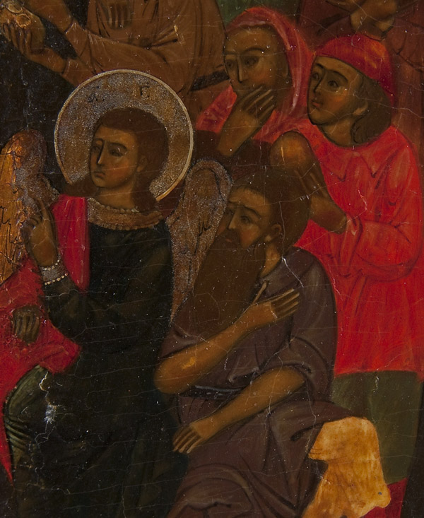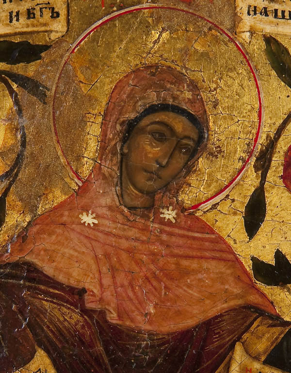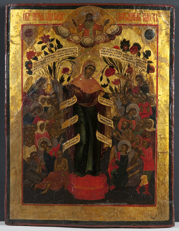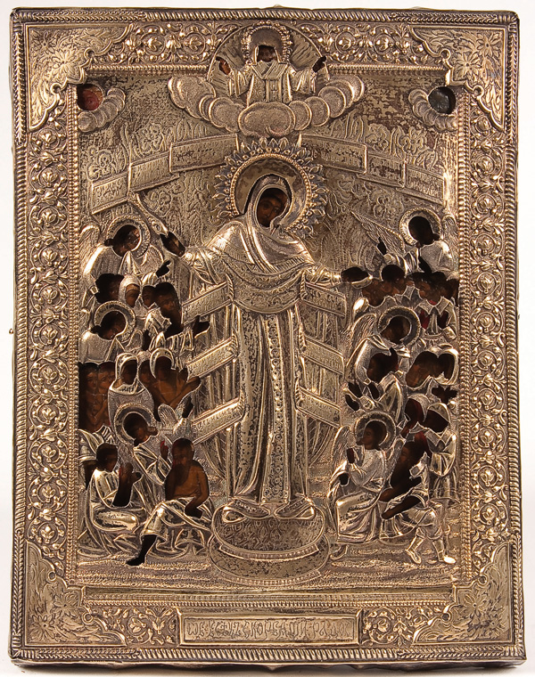 A RUSSIAN ICON OF THE MOTHER OF GOD JOY TO ALL WHO SUFFER, CIRCA 1900. At center the Mother of God. She is surrounded by suffering humans with angels amongst them. They hold scrolls with petitions. Christ, depicted as the Great High Priest, delivers a blessing from the central top margin. Overlaid with an ornate, silver-gilt repousse and chased riza. Hallmarked Moscow 1908-1917, Cyrillic makers mark N.I.Z. and 84 standard. 13.5 inches x 10.75 inches (34cm x 27cm).