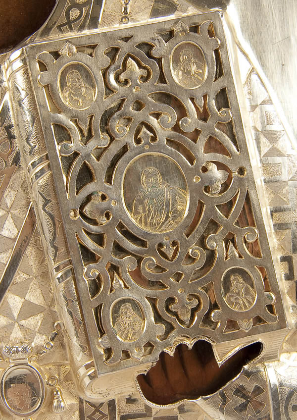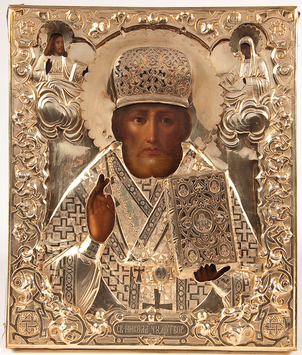 A RUSSIAN ICON OF SAINT NICHOLAS, 19TH CENTURY. Executed in the Italianate style, Nicholas holds the Gospels and delivers a blessing, overlaid with an ornate heavily repoussed and chased silver-gilt riza. With applied haloes and applied filligreed mitre and Gospel cover. Hallmarked St. Petersburg, dated 1869, Cyrillic maker's mark AMG and with 84 standard. 12.5 inches x 10.5 inches (31.5 x 27 cm).