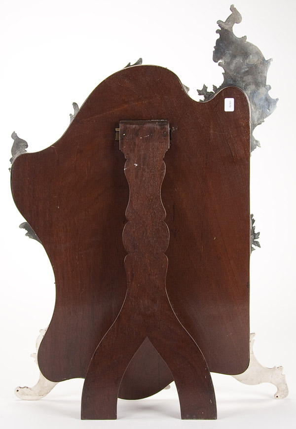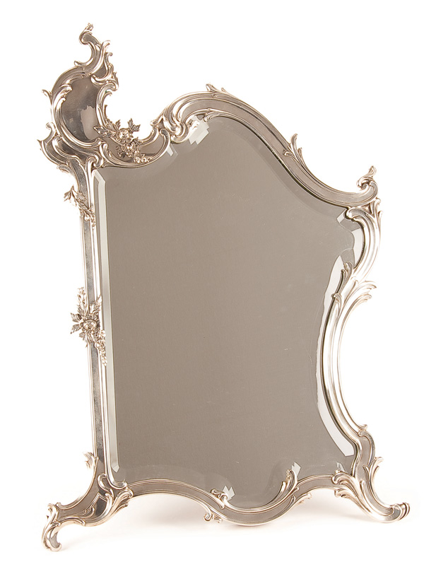 A LARGE AND IMPRESSIVE FABERGE SILVER DRESSING MIRROR IN THE ROCOCO-STYLE, MOSCOW 1899-1908. The extensive silver frame of undulating rocaille form with interspersed flower bouquets holding a shaped beveled mirror. Verso with polished walnut backing and fold-out strut stand. Hallmarked Moscow, 1899-1908, 84 standard and stamped in Cyrillic K.FABERGE beneath the Imperial Warrant. Exquisite! Height 27.5 inches (70cm) Width 19.5 inches (49.5cm).