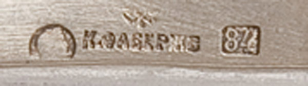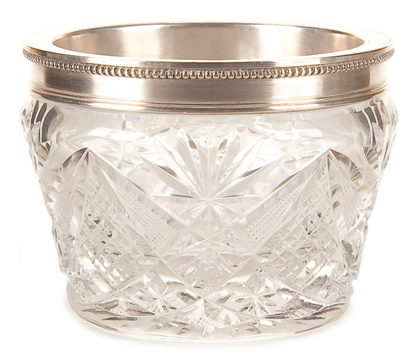 A FABERGE SILVER MOUNTED CUT GLASS BOWL, MOSCOW 1908-1917. The base and side of bowl overall with deeply cut pattern and mounted with a silver beaded rim. Hallmarked Moscow 1908-1917, and in Cyrillic K. Faberge under the Imperial Warrant and with 84 standard. Height 3.25 inches (8 cm), diameter 4.25 inches (10.6 cm).