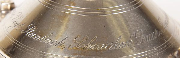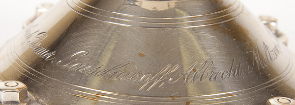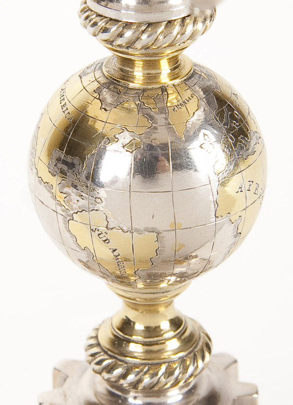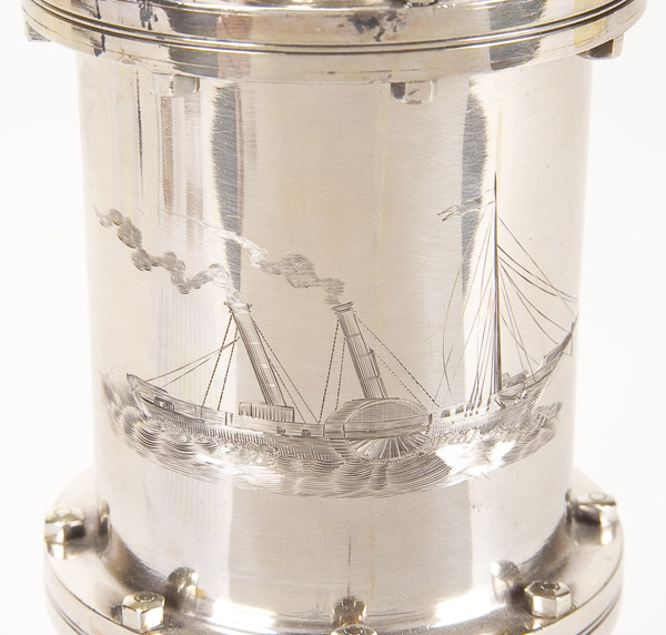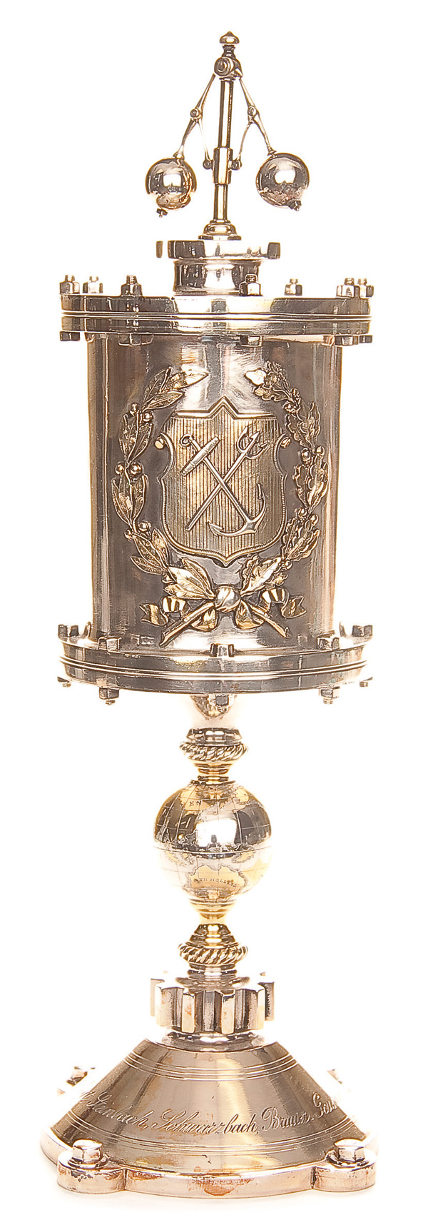AN INTERESTING RUSSIAN SILVER STEAMSHIP/SAILING PRESENTATION TROPHY, SAZIKOV, ST. PETERSBURG, 1867. The domed base set with a gear, out of which rises a stem with central globe shaped node finely engraved and gilded with the seven continents upon which rests a large boiler form fixed covered cup with a flyball governor finial. The sides set with a crest of crossed anchor and trident within a laurel and oak wreath. The verso finely engraved with a side paddle steamship and the base engraved with the following ten names, Schwarzbach, Brauer, Gouselnikoff, Albrecht, Meltzov, Boehnke, Fryer, Sarre, Vogt and Steinbach. Hallmarked Saint Petersburg, dated 1867, Cyrillic makers mark for Ignatiy Sazikov, beneath the Imperial Warrant and with 84 silver standard. Height 12.25 inches (31cm) Total weight 25.75 troy ounces (801 grams).