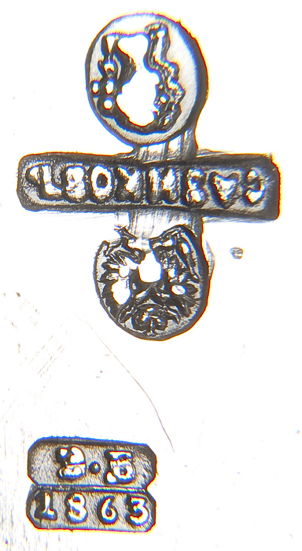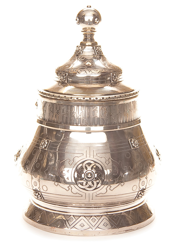 A MASSIVE RUSSIAN SILVER SUGAR BOWL, SAZIKOV, ST. PETERSBURG 1863. The squatty ovoid form resting on a slightly flared rim the sides chased with strapwork and raised medallions and rosettes. The rim chased with a stylized Cyrillic inscription, 'This silver sugar bowl was made by the firm of Sazikov'. The cone shaped fitted lid similarly decorated as the body and with spherical finial and the interior brightly gilded. Base hallmarked St. Petersburg, dated 1863, and in Cyrillic SAZIKOV beneath the Imperial Warrant and 84 silver standard. Height 8.25 inches (21cm). Gross weight 16.27 troy ounces (506 grams).