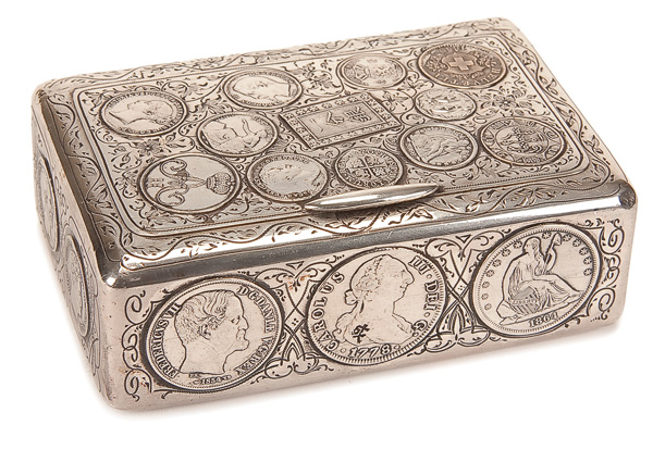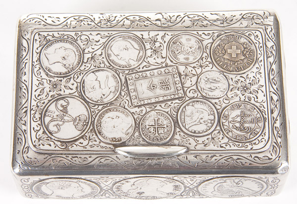 A FINE RUSSIAN SILVER COIN BOX, ST. PETERSBURG, 19TH CENTURY. The rectangular box with rounded corners, the sides and hinged lid set with various world coins. The background and borders chased with scrolling foliage, the base engraved with strapwork, florals and Cyrillic monogram ???. The interior gilded and hallmarked St. Petersburg, Cyrillic makers mark ФК, and with 84 standard. Length 5 inches, depth 3.25 inches, height 1.6 inches (12.7cm, 8.5cm, 4cm). Gross weight 14.44 troy ounces (449 grams).