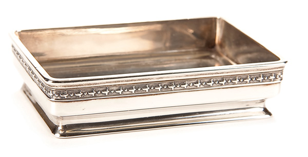 A FABERGE SILVER FOOTED TRAY, MOSCOW 1908-1917. The rectangular tray raised on a slightly flared foot and the rim banded with bell flowers. Hallmarked Moscow, 1908-1917, and in Cyrillic K.FABERGE beneath the Imperial Warrant and with scratched inventory number 29396. Length 4.25 inches (10.8cm).
