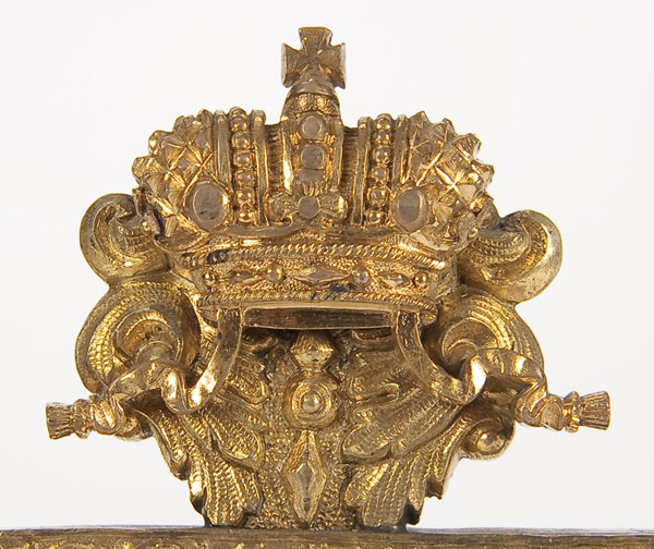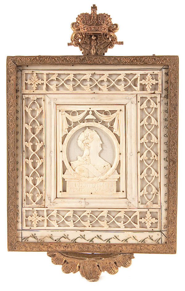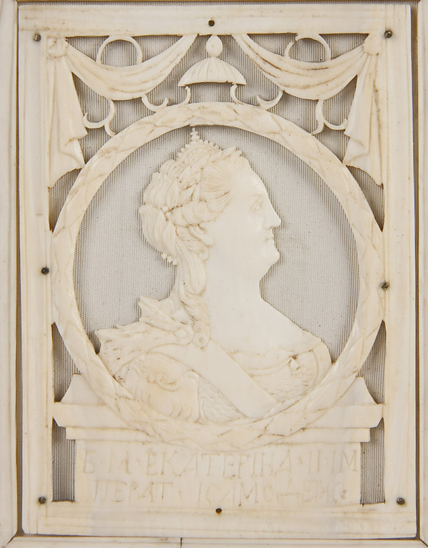 A RUSSIAN CARVED IVORY PLAQUE DEPICTING CATHERINE THE GREAT, KHOLMOGORY, 18TH CENTURY. The profile facing right carved in relief with cascading hair set with crown, scalework breastplate and sash within a circular laurel wreath set in a frame with swags in the upper corners and resting on a plinth engraved with abbreviated inscription By the Grace of God Her Imperial Highness Katherine II Empress of All Russia, and set within a larger framework of pierced carved foliate scrolls, the outer margins tinted, and the entire image laid against a faded light blue silk ground. Contained in a glazed gilt-bronze frame with crown finial and suspension loop. 6 inches x 5.2 inches (15.2 x 13.2cm).