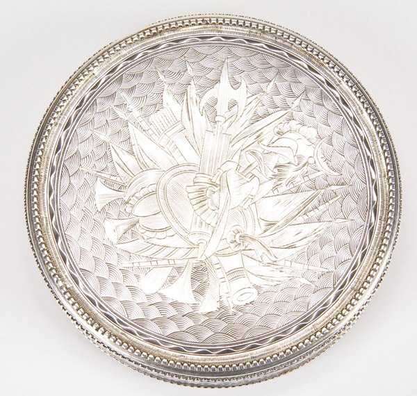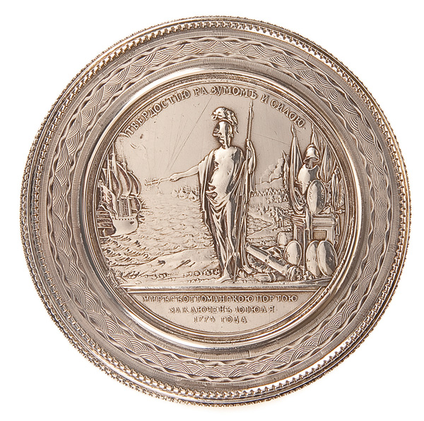 A FINE RUSSIAN SILVER BOX, MOSCOW 1789. The circular box with chased designs and beaded borders, the lid set with a silver medallion commemorating the Treaty of Kutchuk Kainadji of July 10, 1774. The verso finely engraved with military trophies against a fish scale ground. Each piece (base and lid) clearly marked Moscow and dated 1789. Diameter 3.6 inches (9.2cm)
