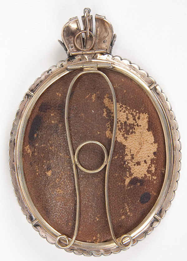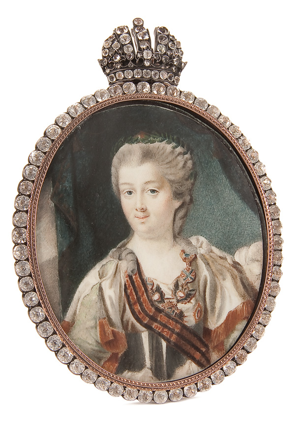 A VERY FINE MINIATURE PORTRAIT OF CATHERINE THE GREAT, RUSSIAN SCHOOL, PROBABLY 18TH CENTURY. After the painting by Dmitriy Levitskiy (1735-1822). Depicted in a white silk dress with red trim and ermine cloak and with a laurel wreath resting upon her upswept powdered hair falling over her shoulders and wearing the chain of the Order of St. Andrew and the sash and star of the Russian Order of Saint George. Watercolor on ivory set in a vermeil oval pendant frame encircled with paste stones with crown finial and suspension loop on verso with folding strut stand. Height 4.25 inches (11cm)